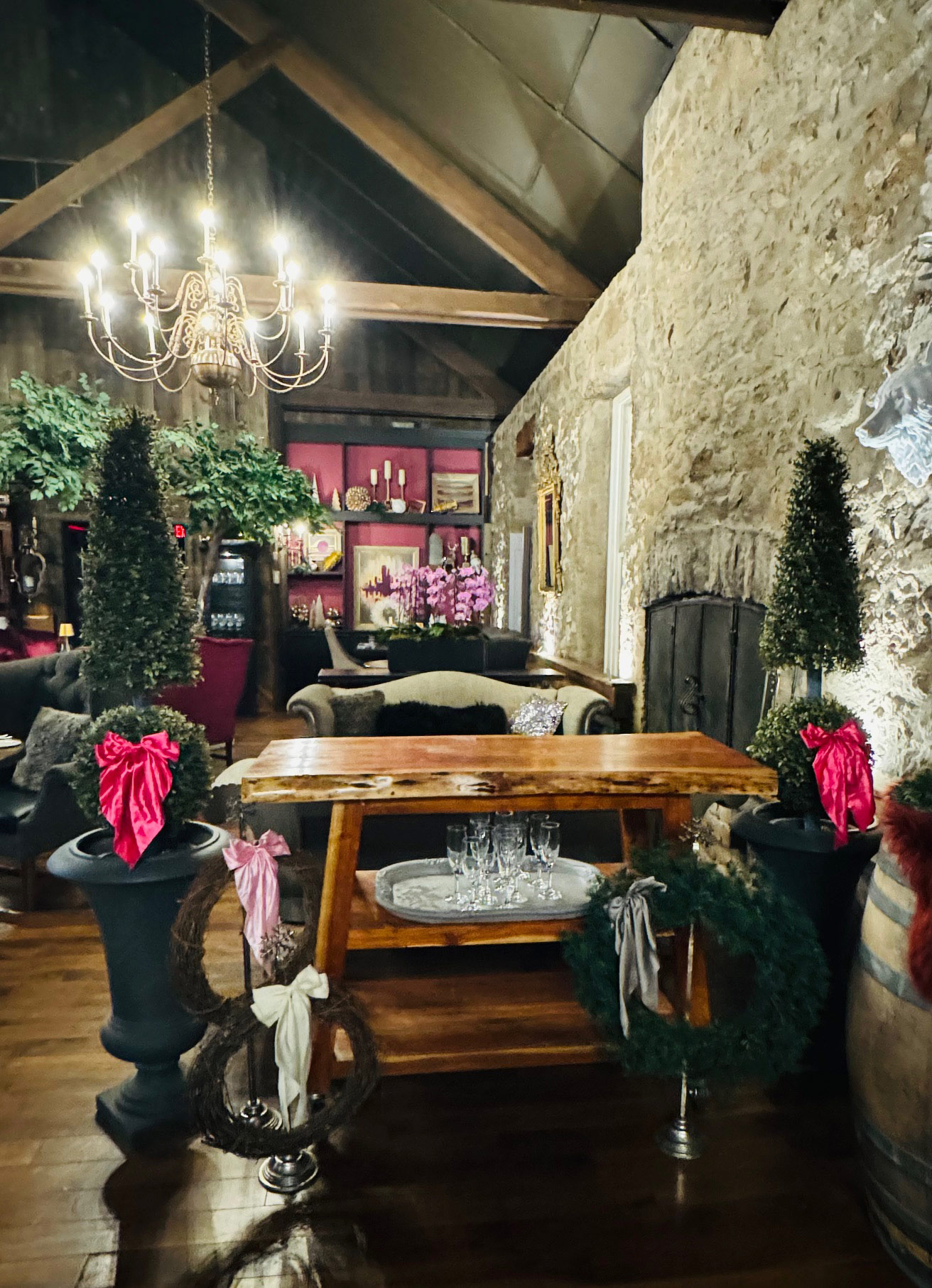 Hidden beneath the Old Stone Inn, this Victorian-inspired speakeasy offers an intimate and moody retreat featuring craft cocktails, music, and the Merry + Bright seasonal menu.